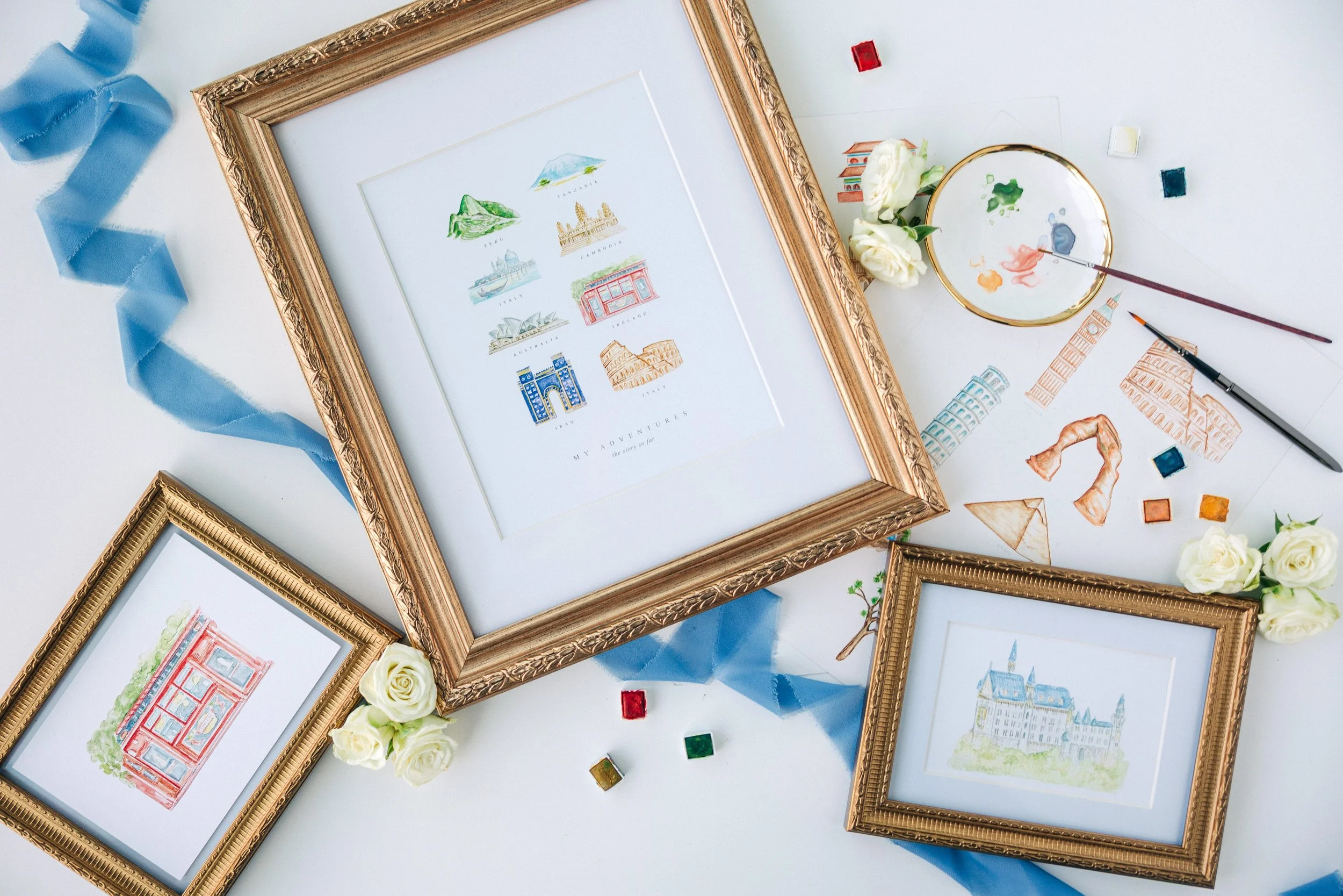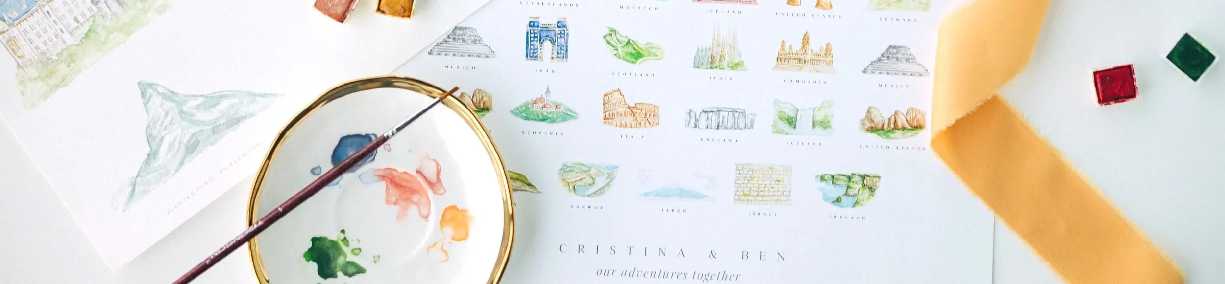I create hand-painted watercolor pieces, continuous line illustrations, travel and heritage prints (coming soon!), and personalized heirloom ornaments. Each piece is made from your photos, stories, or selected countries and designed to feel timeless, meaningful, and beautifully personal.